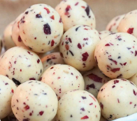 Hazelnuts wrapped in white chocolate with delicate rose flavor infusion.